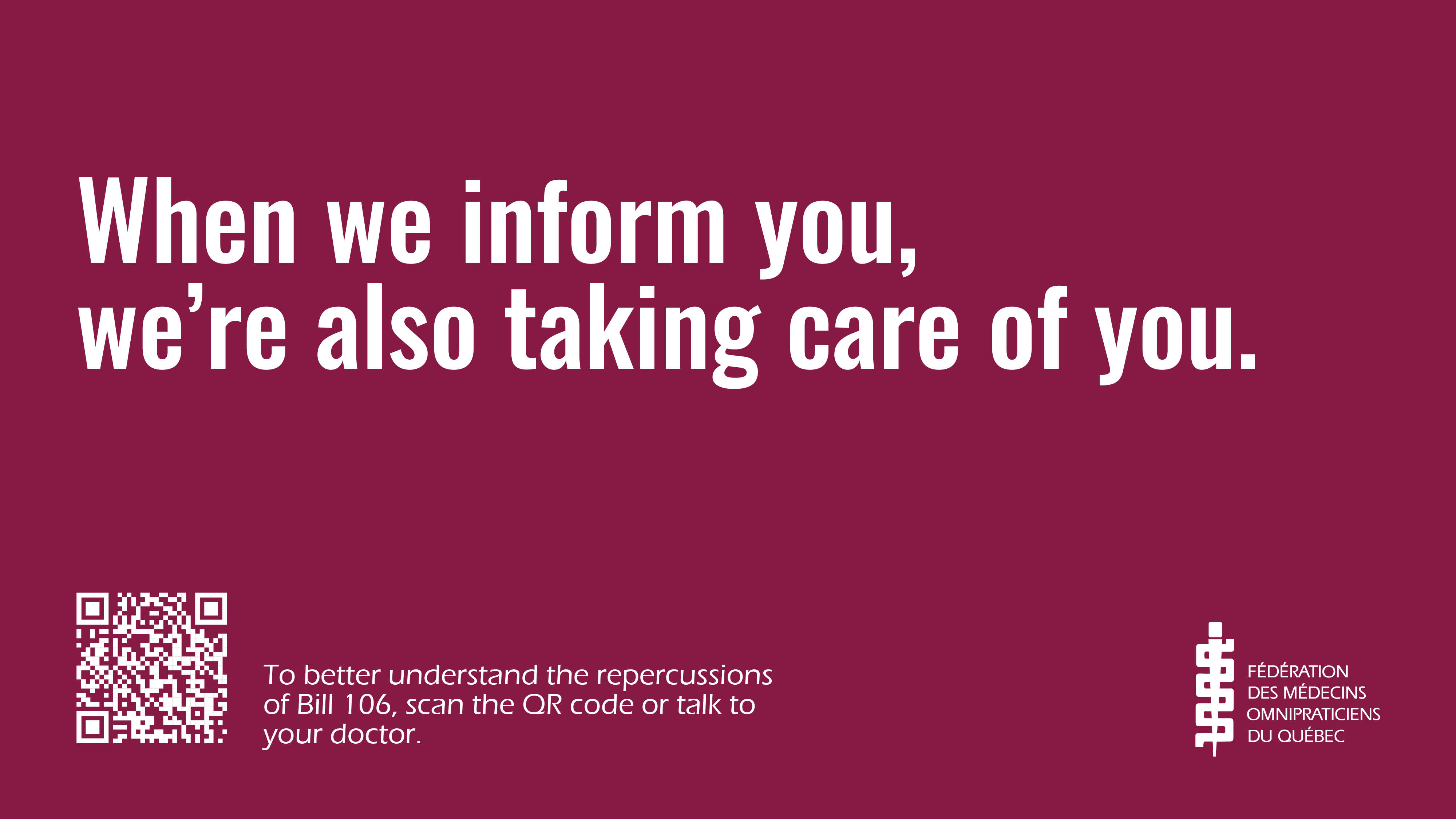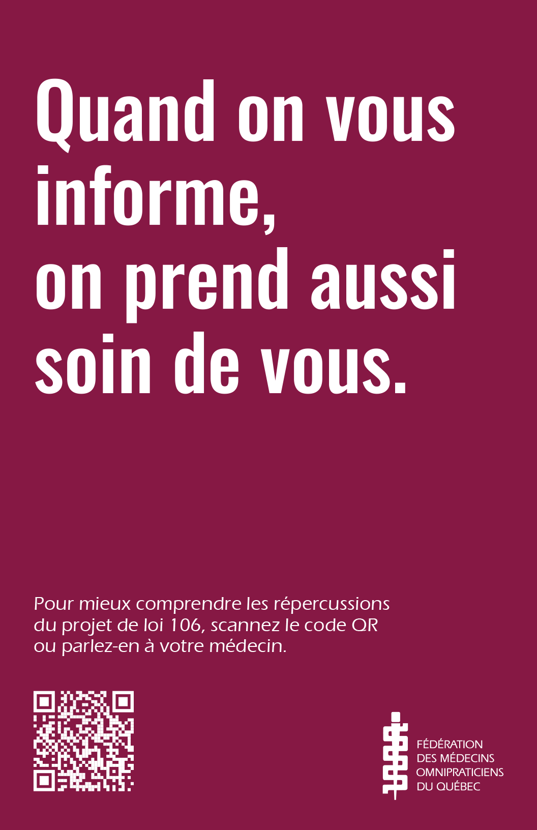 Le 2 juin dernier, la FMOQ a rendu publique une page d'information sur le projet de loi 106 (version anglaise : What is Bill 106?) destinée à la population. Pour mieux comprendre ce dont il s'agit, pour mieux comprendre les enjeux relatifs au projet de loi 106, la FMOQ met à la disposition de ses membres une publicité (affiche imprimable et numérique) dans les deux langues pour informer leurs patients.